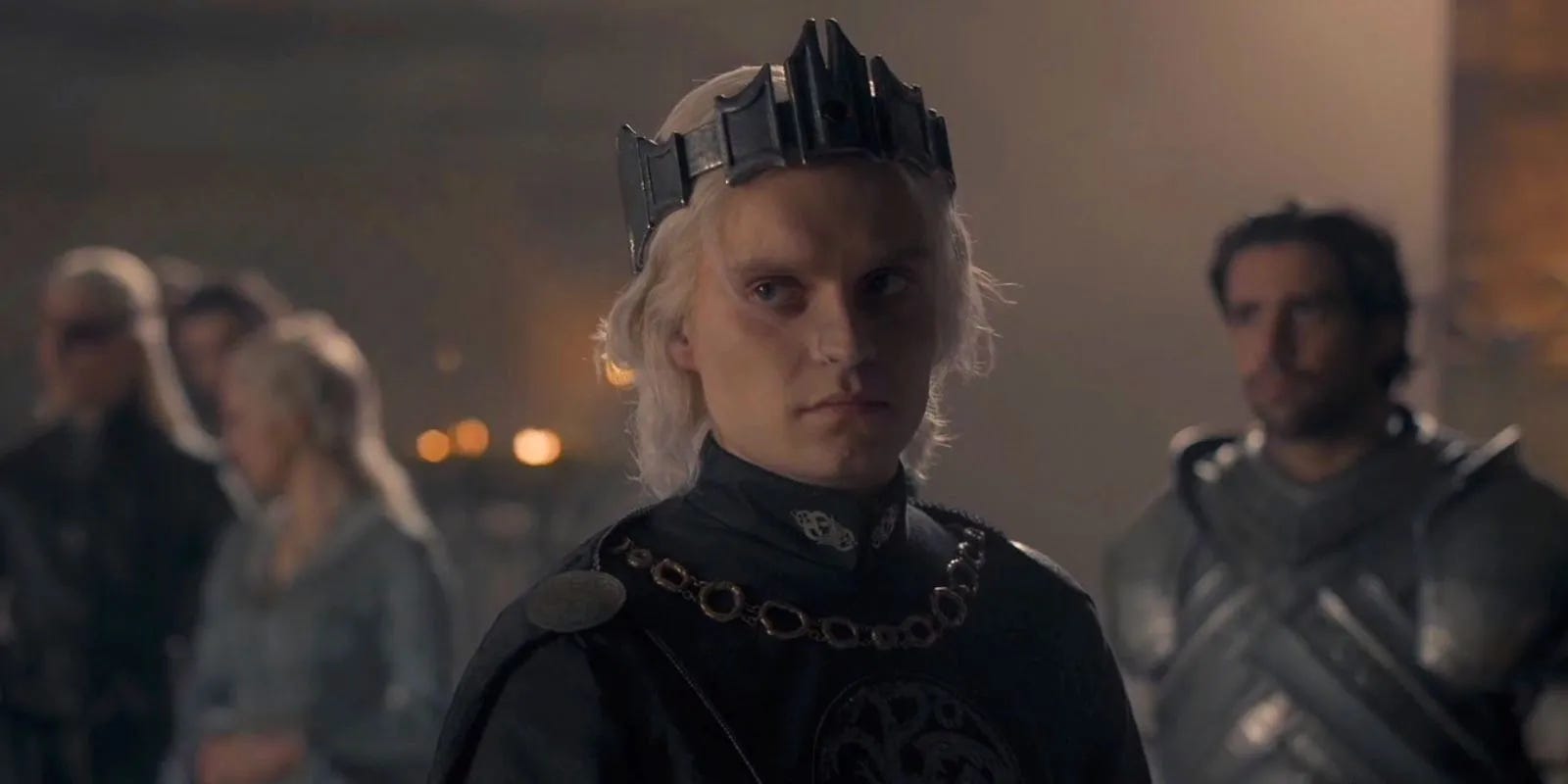 King Aegon and Prince Aemond offer more depth because they’re not just at odds with their own desires but also with their own positions as well. Aegon is placed on the throne to oust Rhaenyra. He doesn’t want to rule, but he’s lured into it by its structural tie to the love of the people. Aemond, on the other hand, overidentifies with being a Targaryen. He’s forever conscious of the role, and he behaves like the Terminator in his constant conformity. Aemond is ruthless and calculating, and he has the strongest dragon, but both he and Aegon show how the role never fits.
