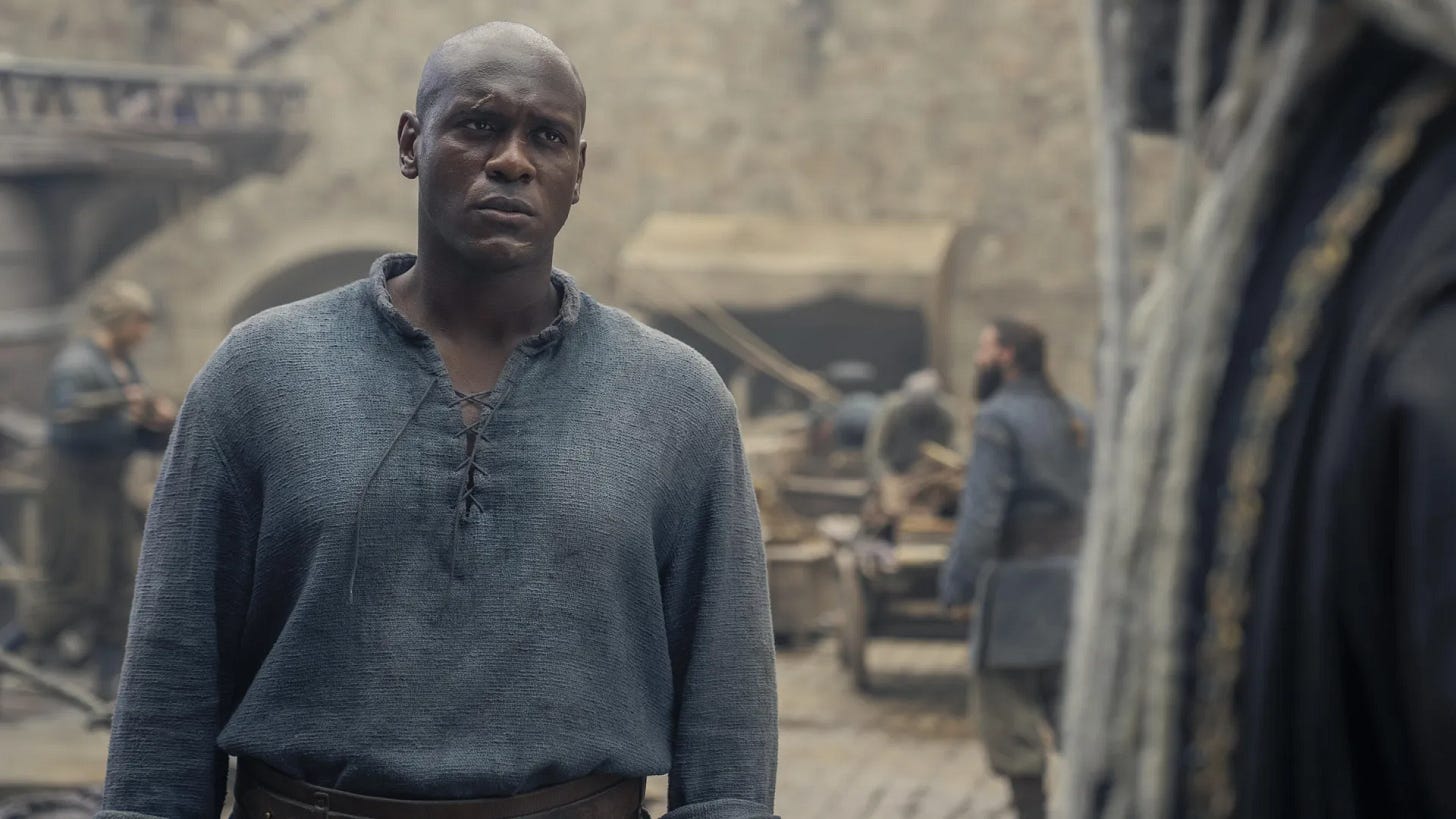 Corlys Velaryon is the most powerful figure in HotD without a dragon, and he does nothing in S2 but struggle to be some sort of external father figure for his two adult children out of wedlock. He visits them again and again with tense, unspoken attaboys, and this presents us with an expectation of achievement. Addam does this; he rises from commoner to dragonrider. But Alyn suffers under this bombarding demand to become more than he is, to be Corlys’s heir and the leader of a powerful house.